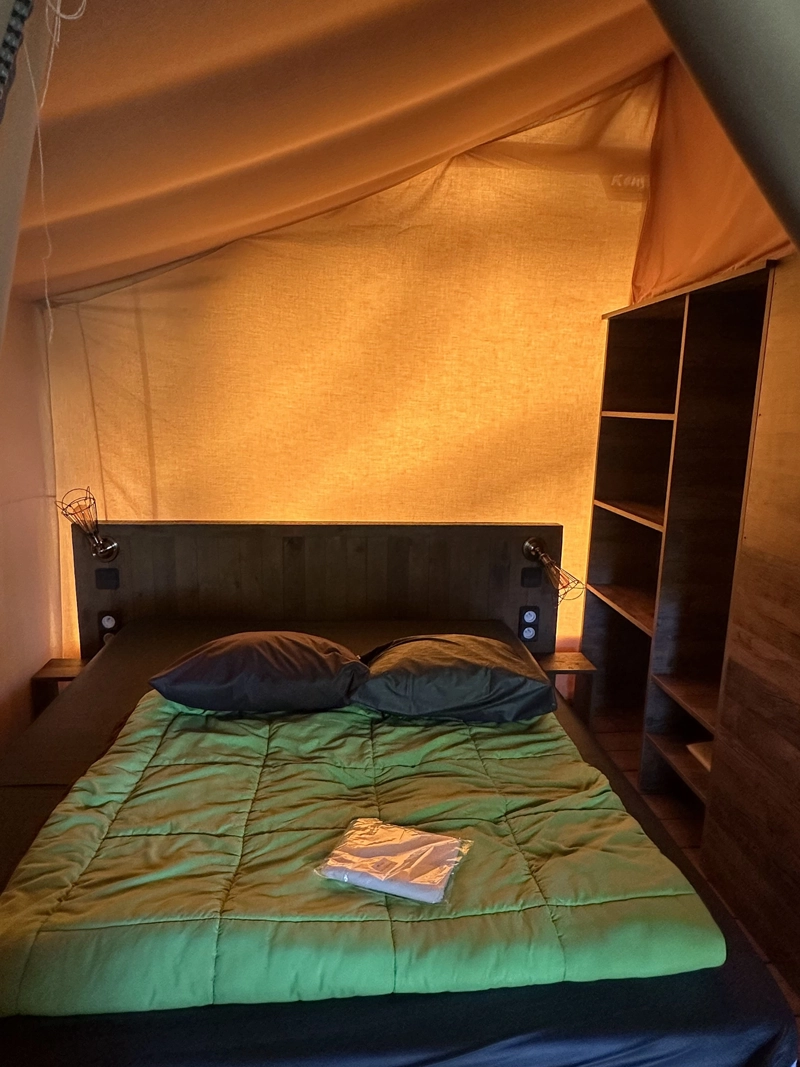 Kenya Lodge Tent F, zonder badkamer of warm water, een unieke glamping-ervaring in safaristijl. Gebouwd op palen, combineert deze tent charme en comfort, met een